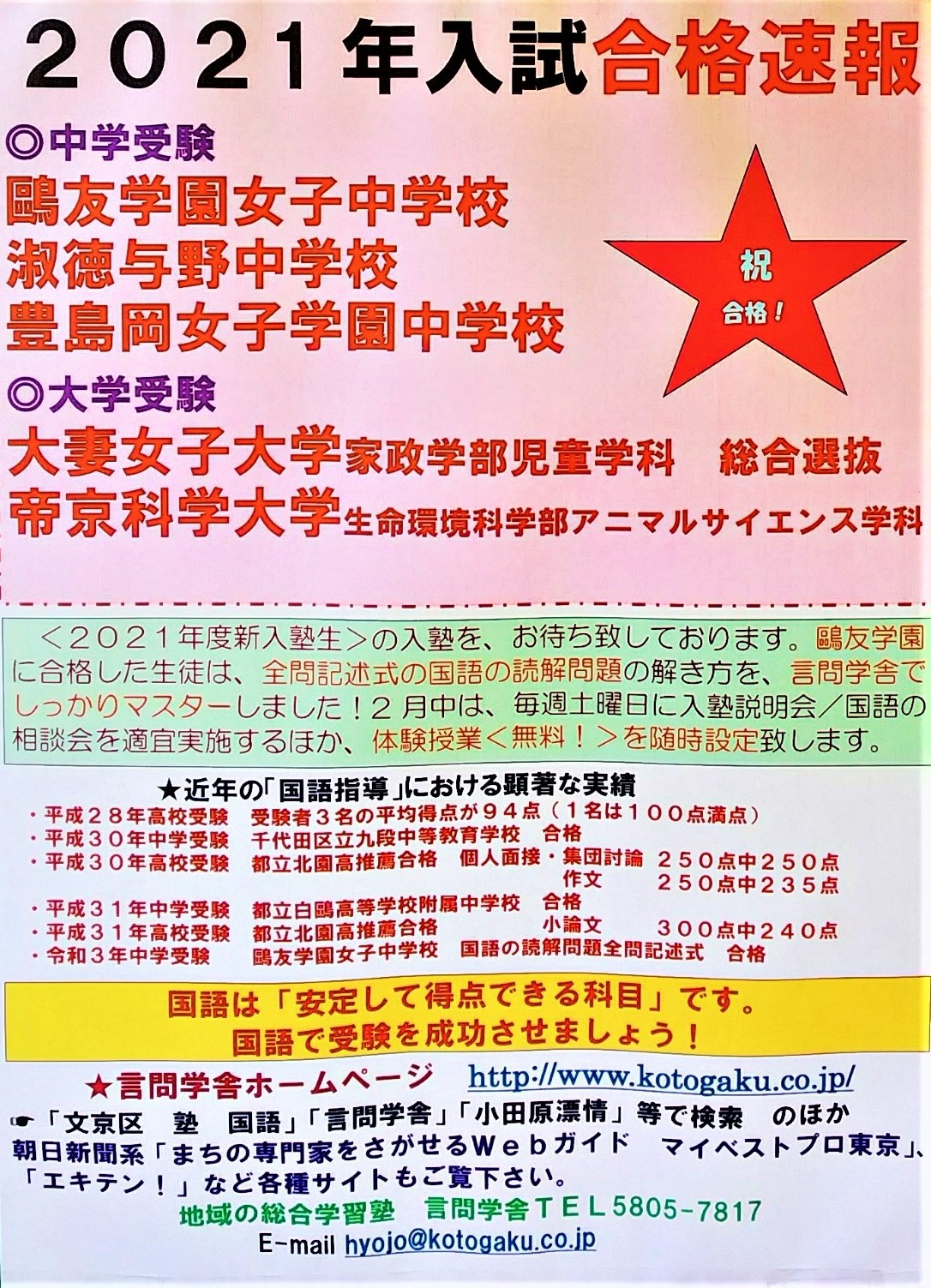 昨日(2月2日)、1日入試と2日入試、それぞれの合格発表があり、大変大きな合格の報せがもたらされました。鷗友学園女子は国語の読解問題が全問(90点分)記述式であり、言問学舎の国語指導の力が大きな成果に結びつきました。